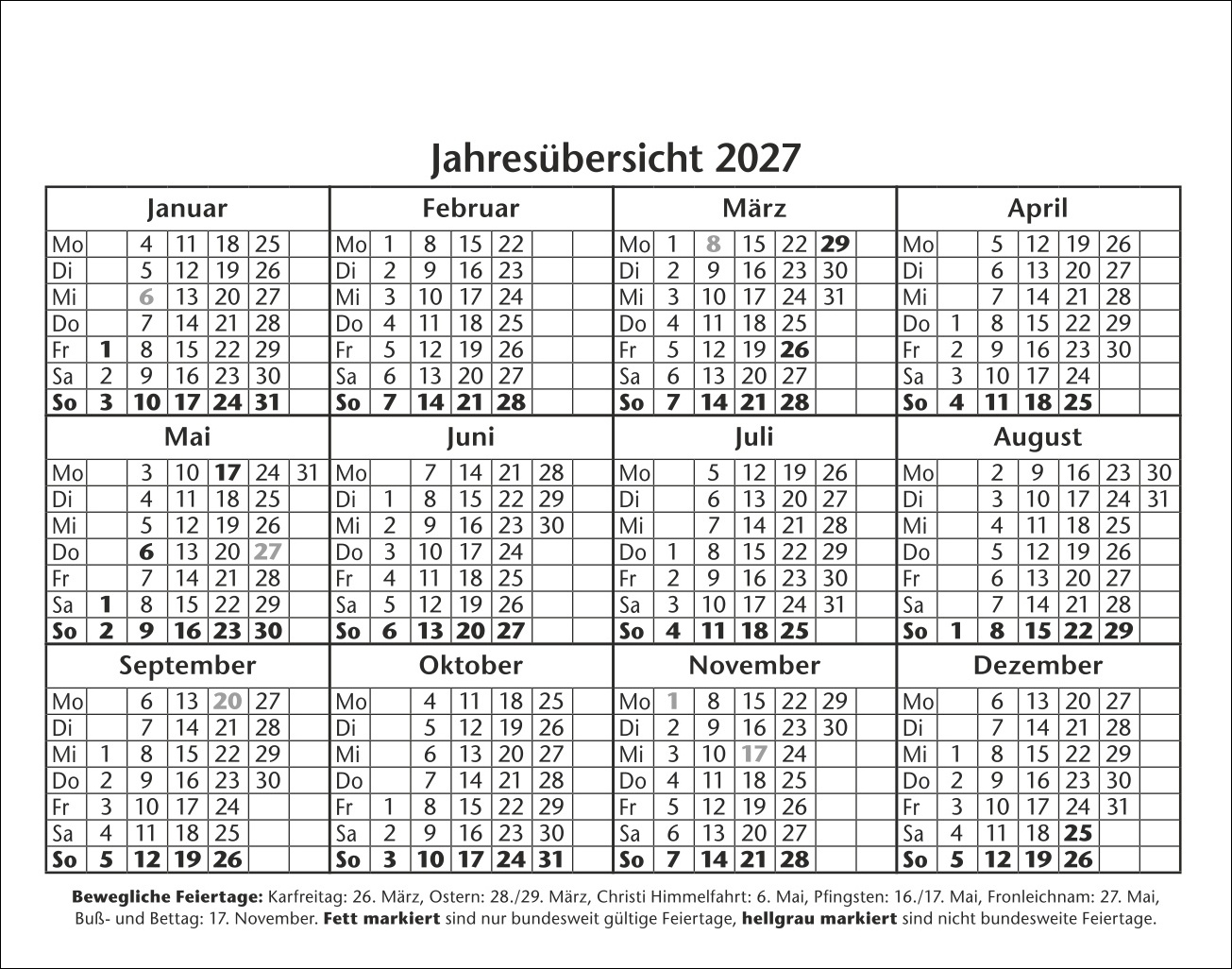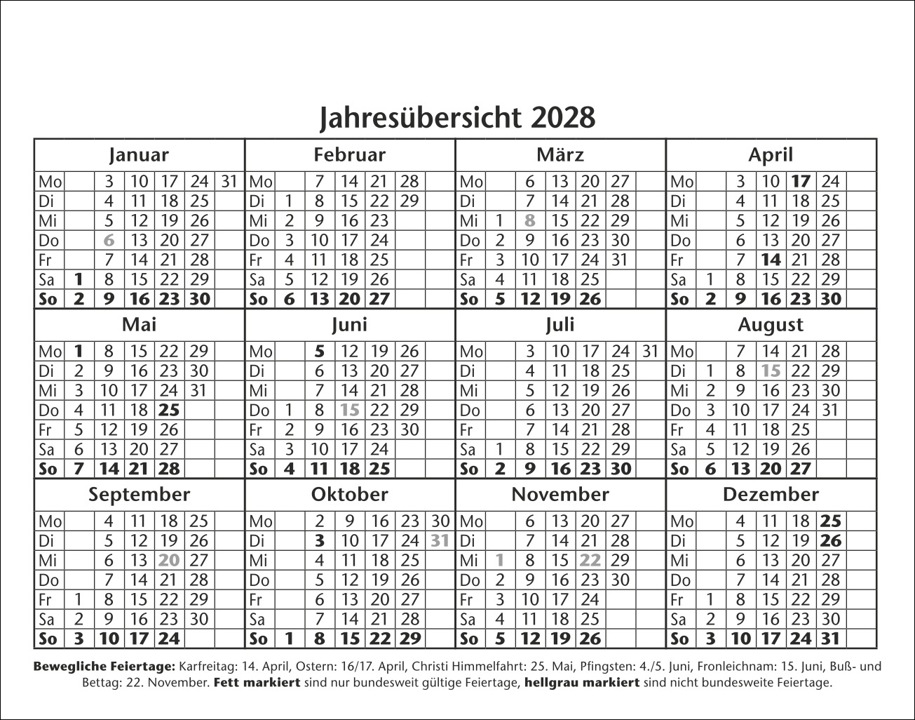 - Jeder Wochentag ein Kalenderblatt, Samstag/Sonntag auf einem Blatt.