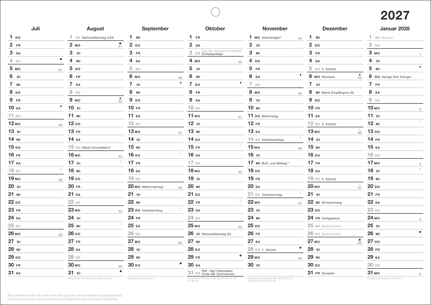 - Schlichter Wandkalender 2027 im Minimalist Design: Eine Spalte pro Monat inklusive Feiertage
