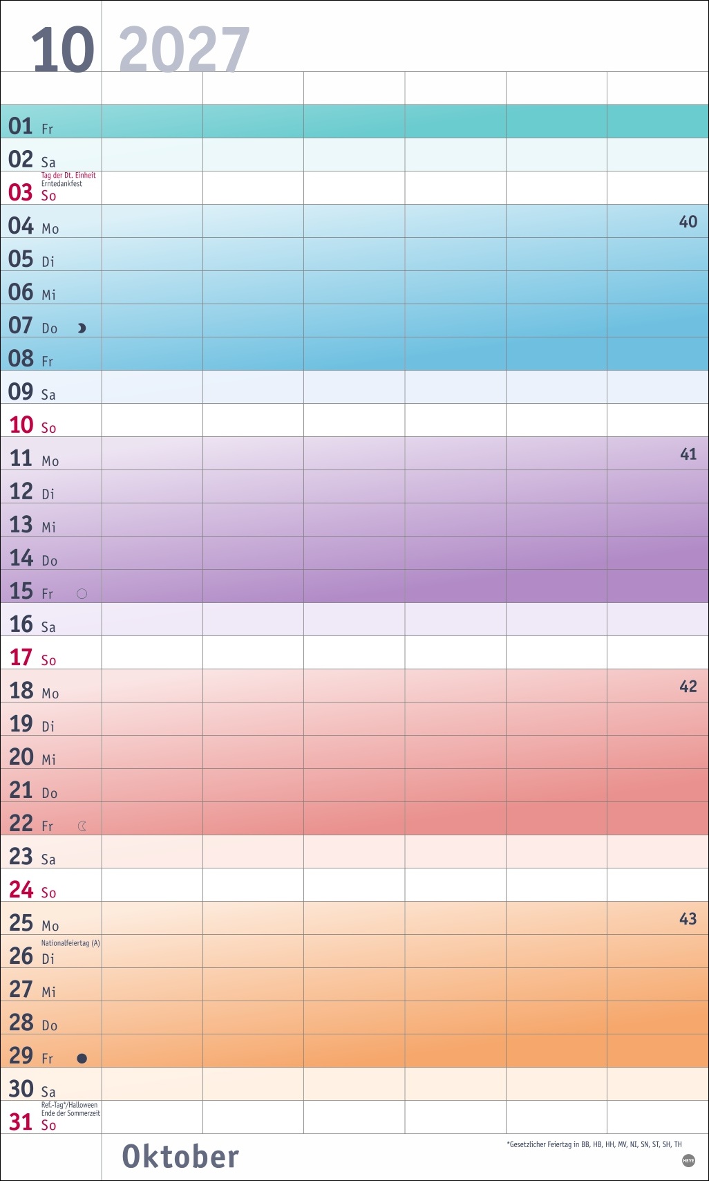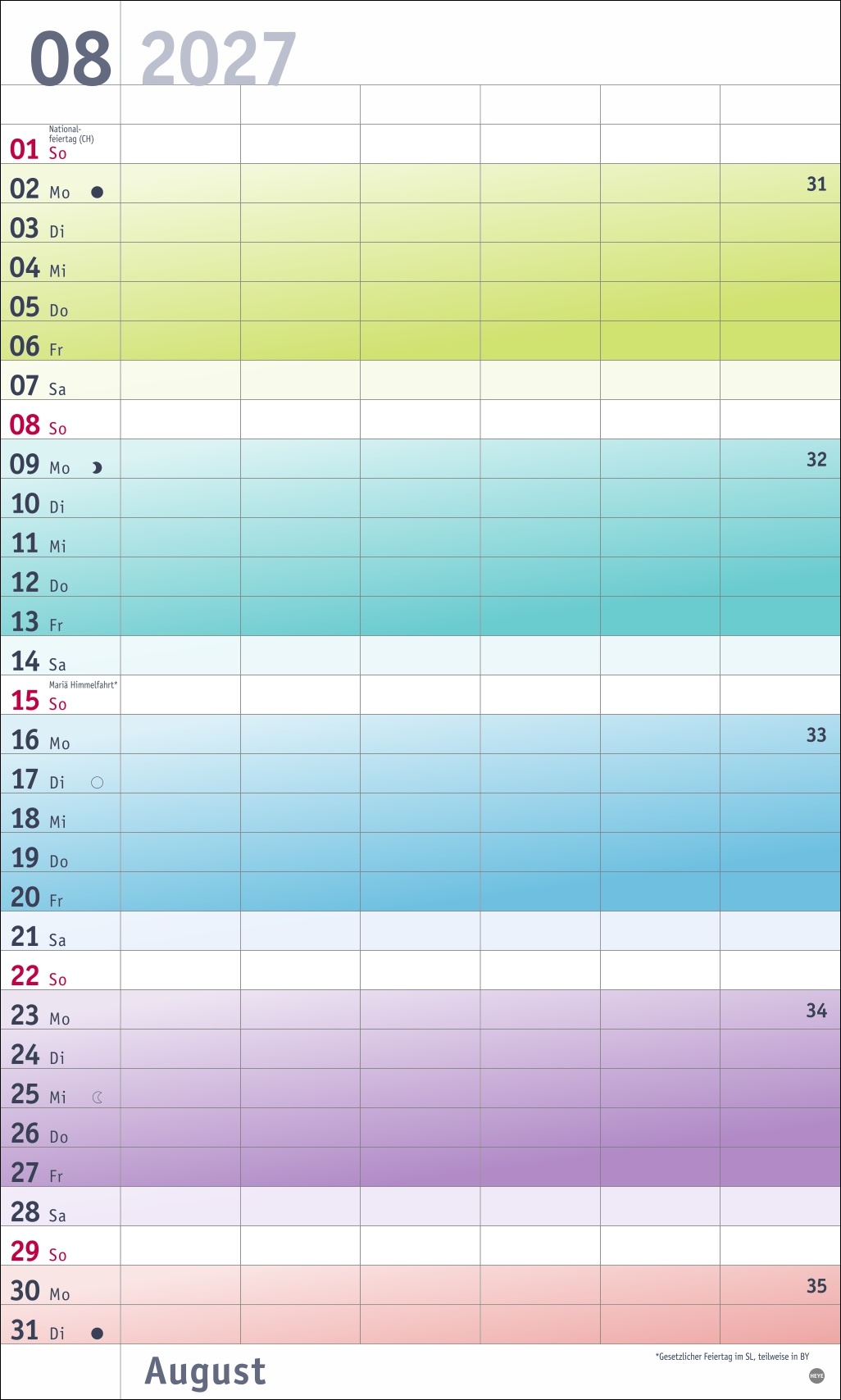 - Unser erfolgreiches Konzept für Familienplaner: 6 Spalten mit ausreichend Platz für Termine, Feste und Freizeitvergnügen, inklusive Schulferien und 3-Monats-Vorschau aufs Folgejahr