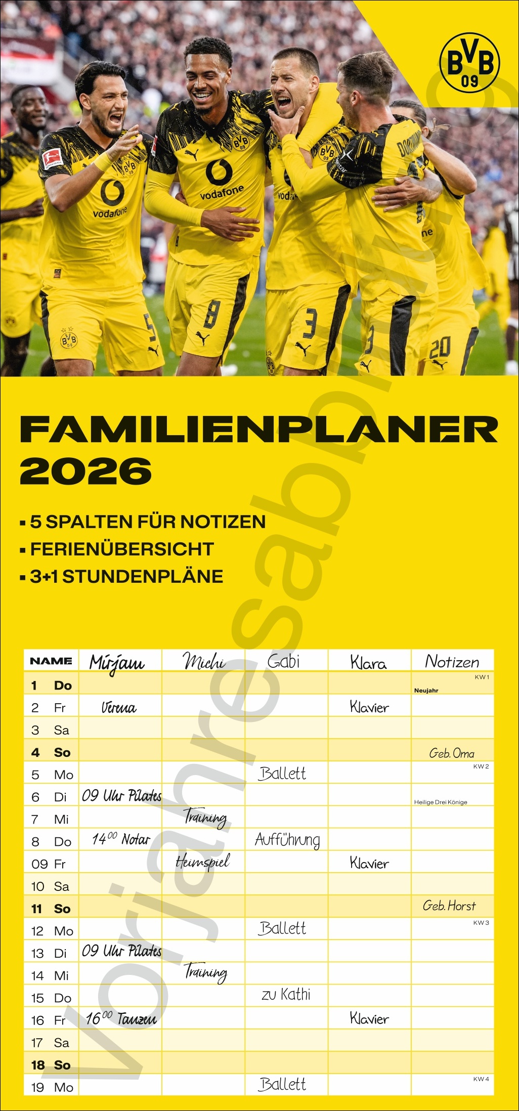 - Jedes Jahr ein gern gesehenes Geschenk für große und kleine BVB-Fans: Kalender mit zahlreichen Extras wie Schulferien und Stundenplänen