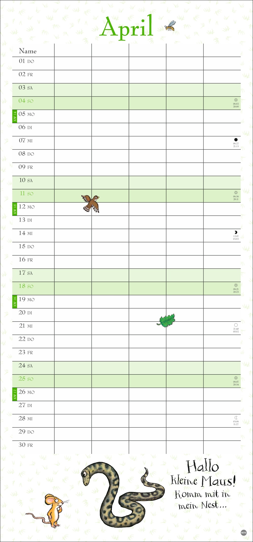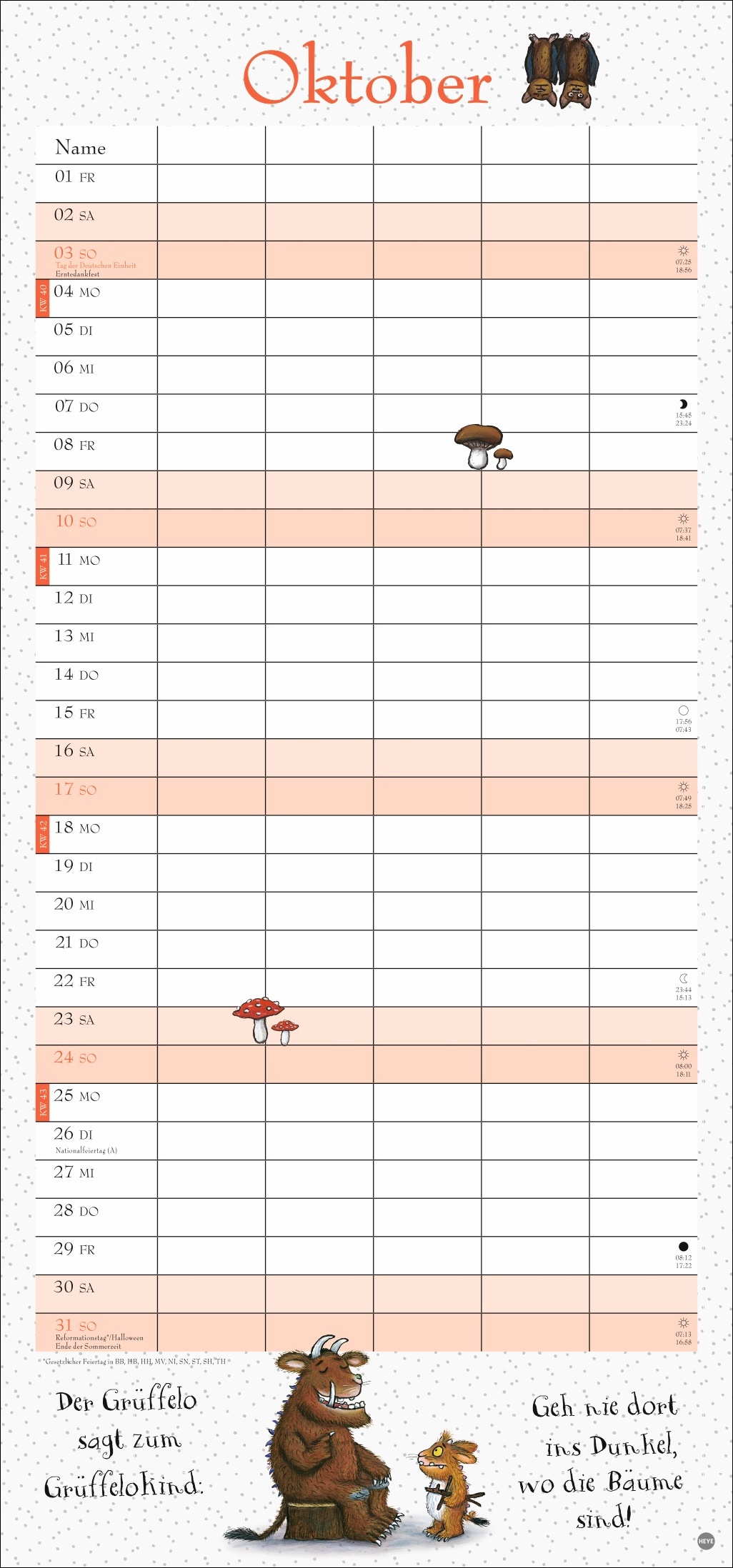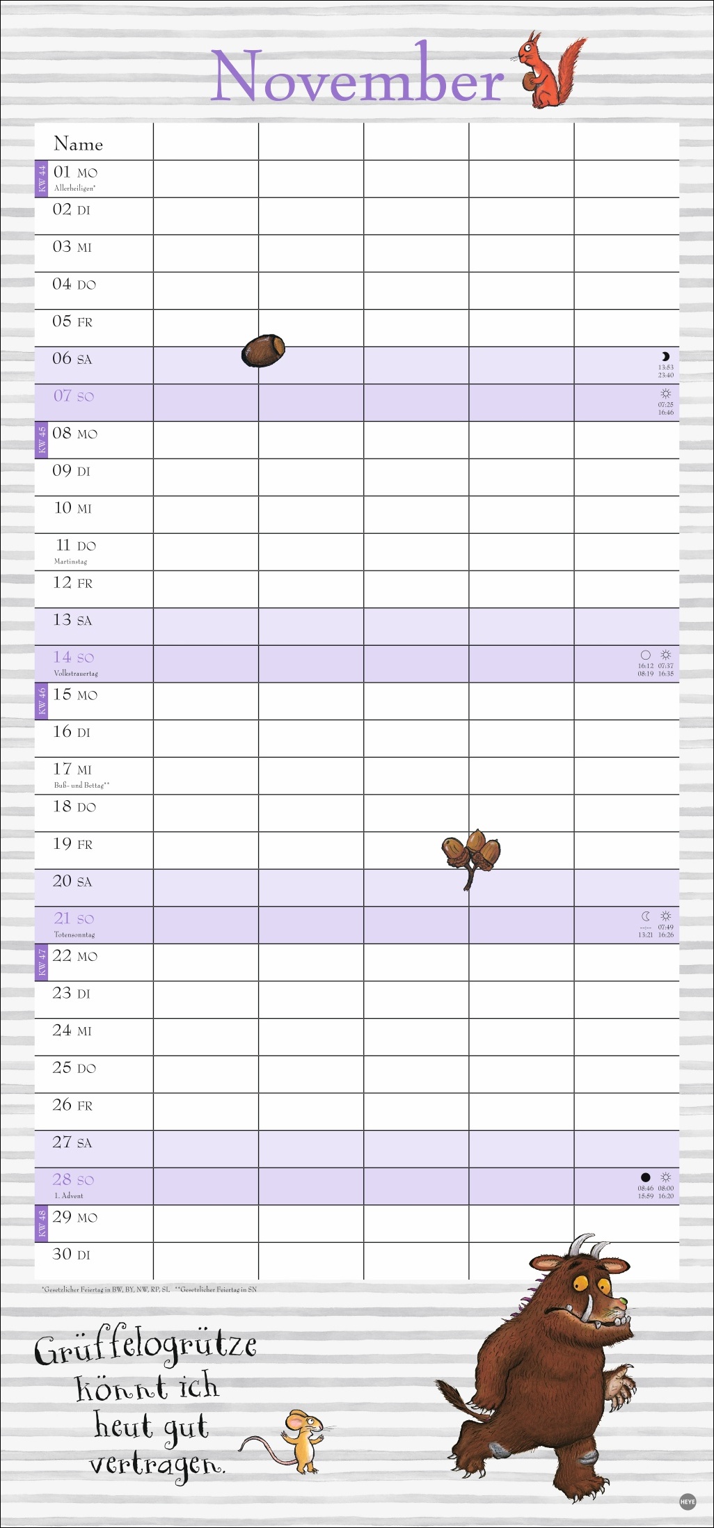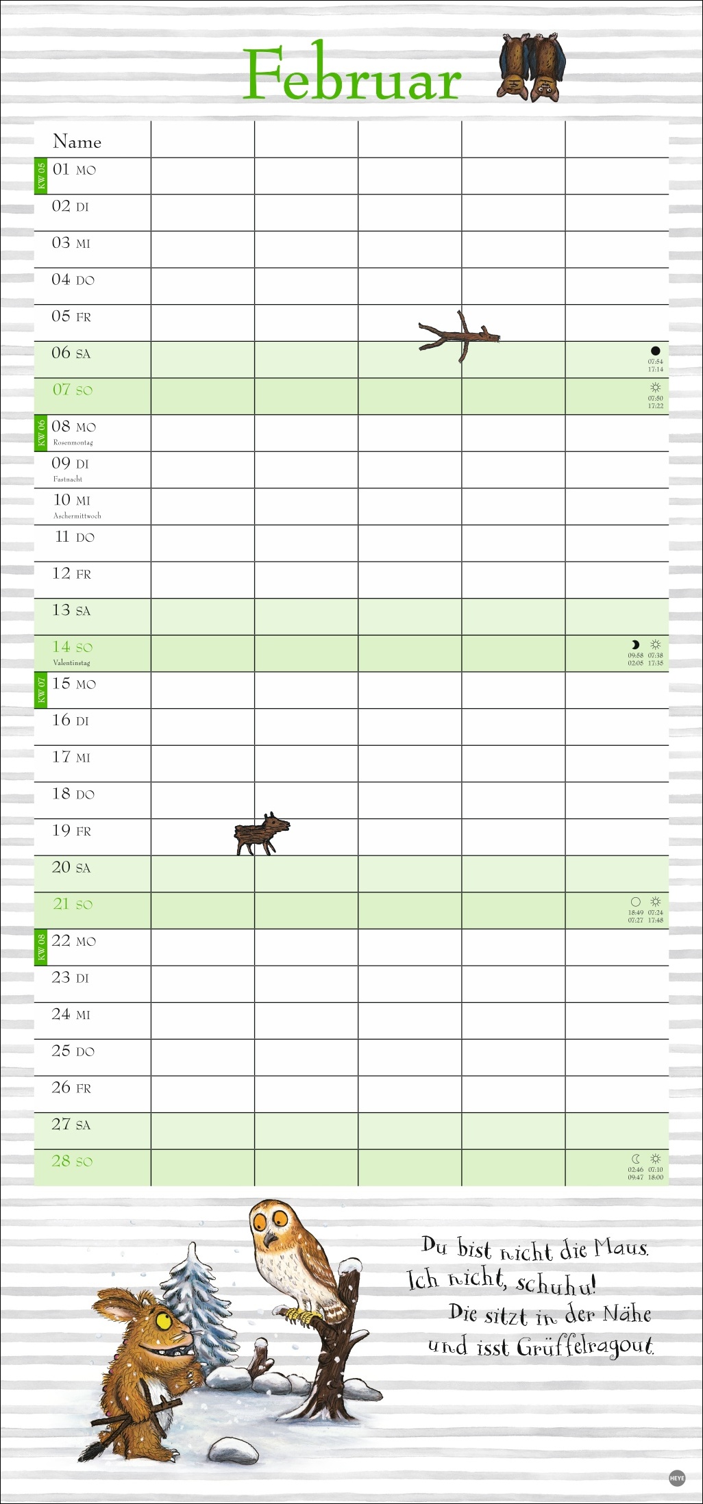 • Das ideale Geschenk für alle kleinen Mäuse und ihre Eltern: Der Grüffelo-Familienkalender mit 5 Spalten und 3-Monatsvorschau aufs Folgejahr