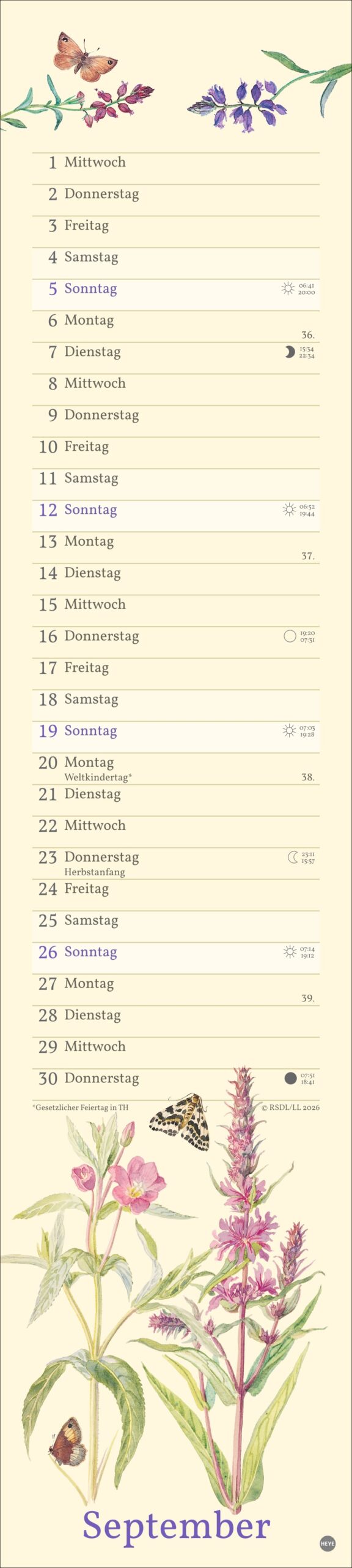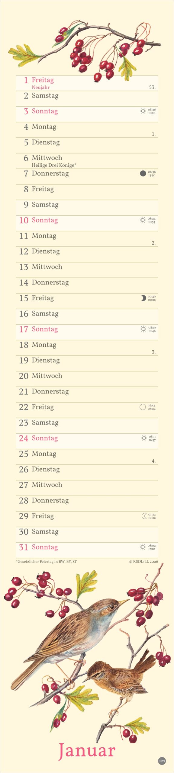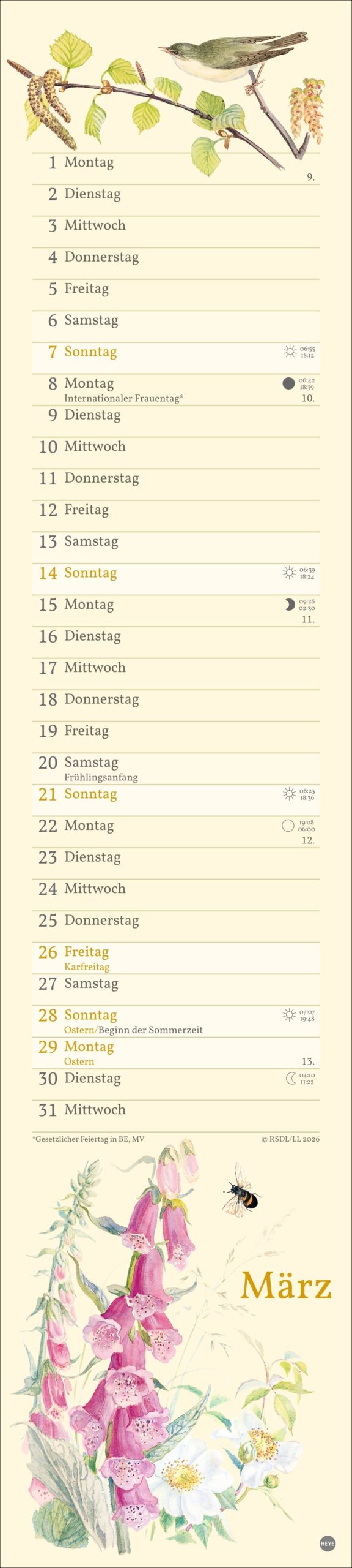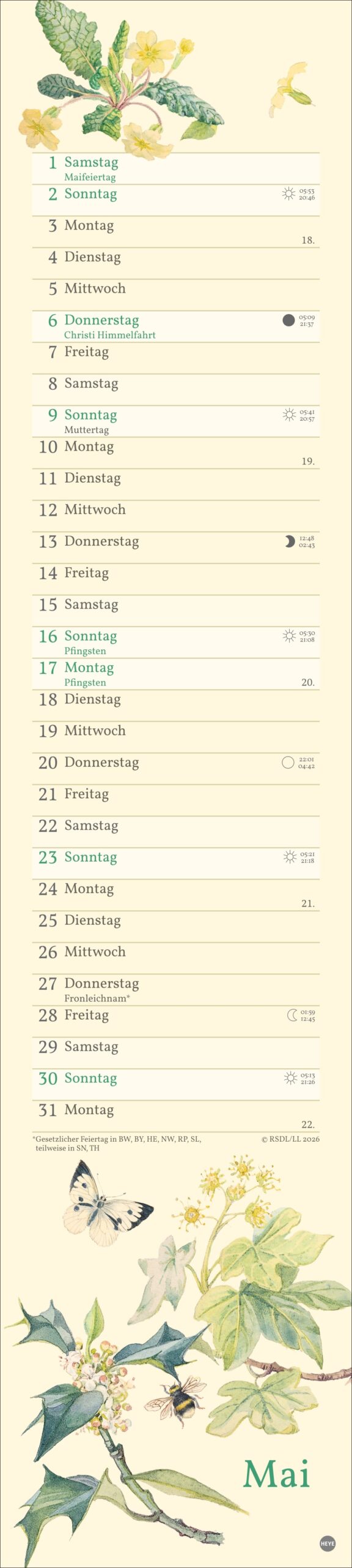 - Übersichtlich und klar strukturierter Streifenkalender: die schönen Tier- und Pflanzenzeichnungen sorgt dafür, dass Sie keinen Termin übersehen