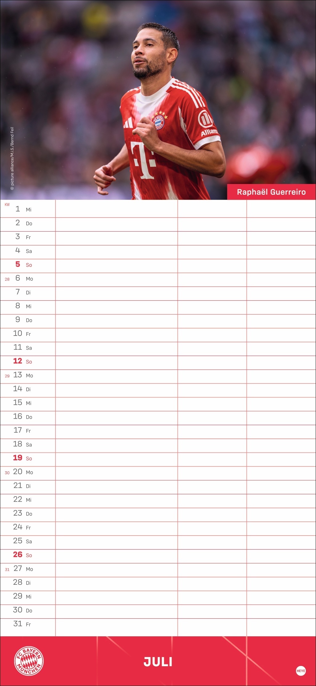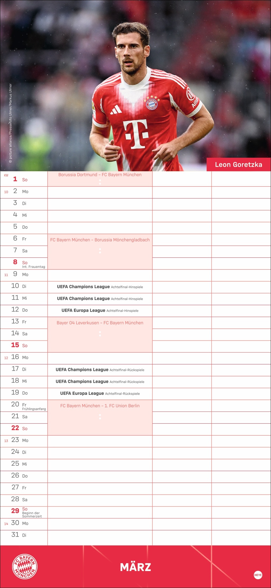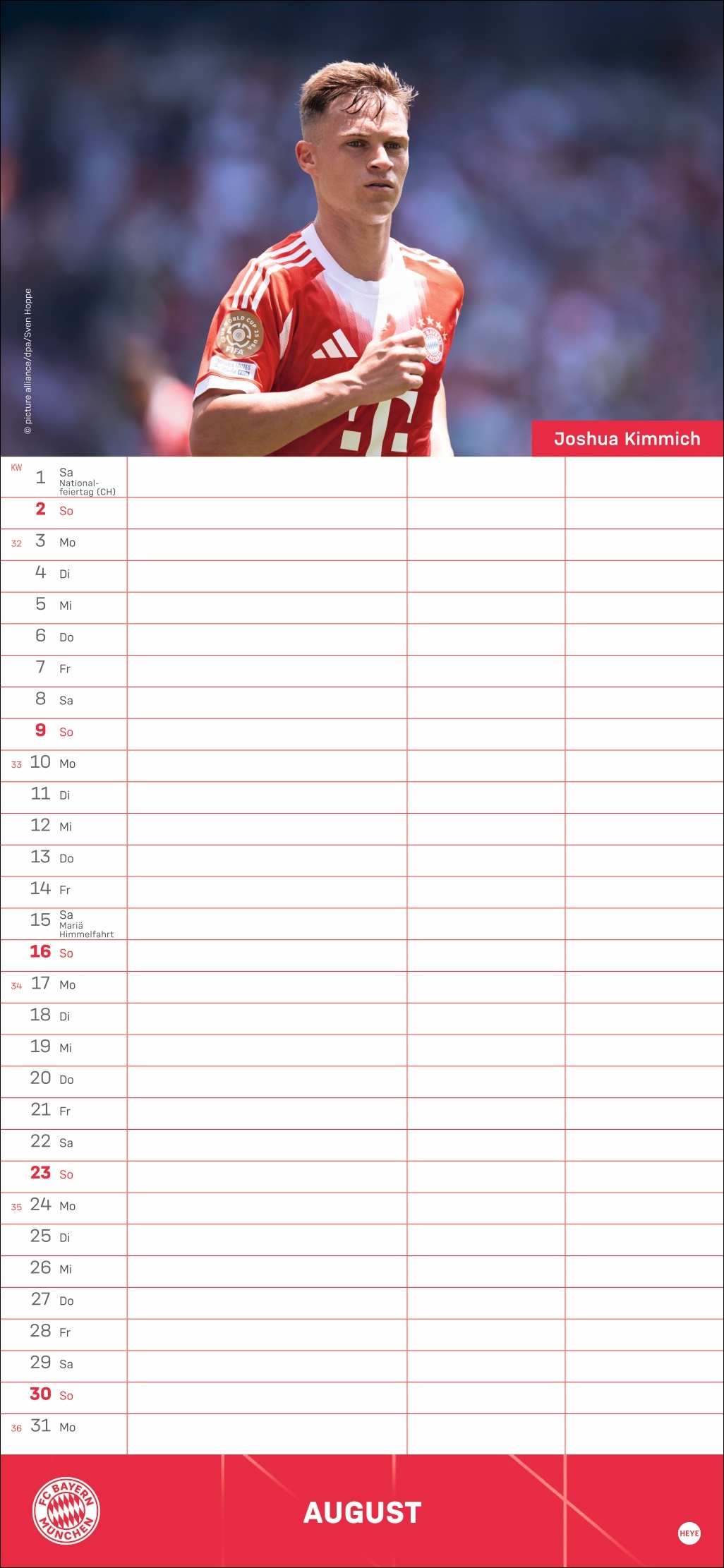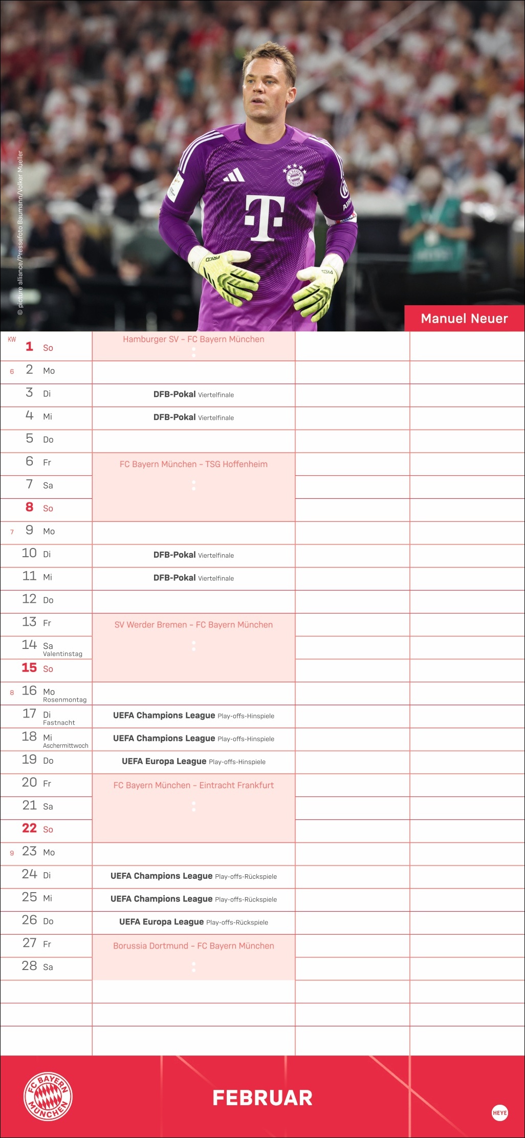 • Besser planen mit den Fußball-Stars des Rekordmeisters: Monatlich neue Porträts von Neuer, Kimmich, Müller und Co.