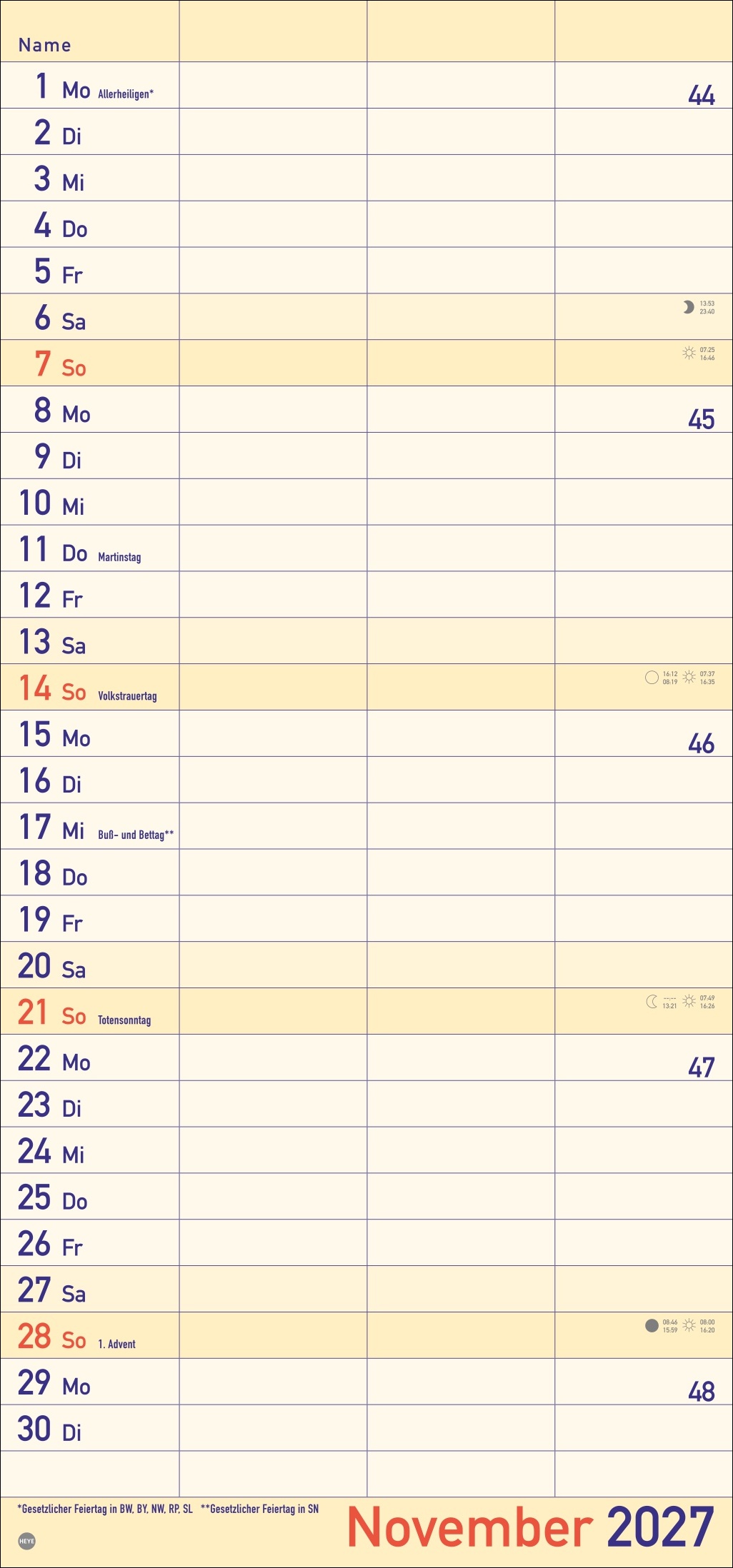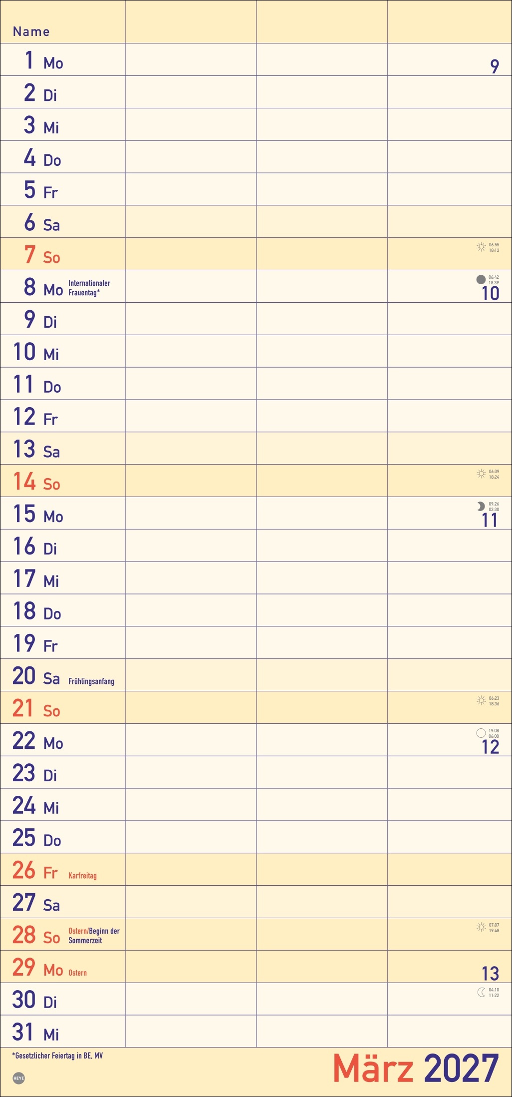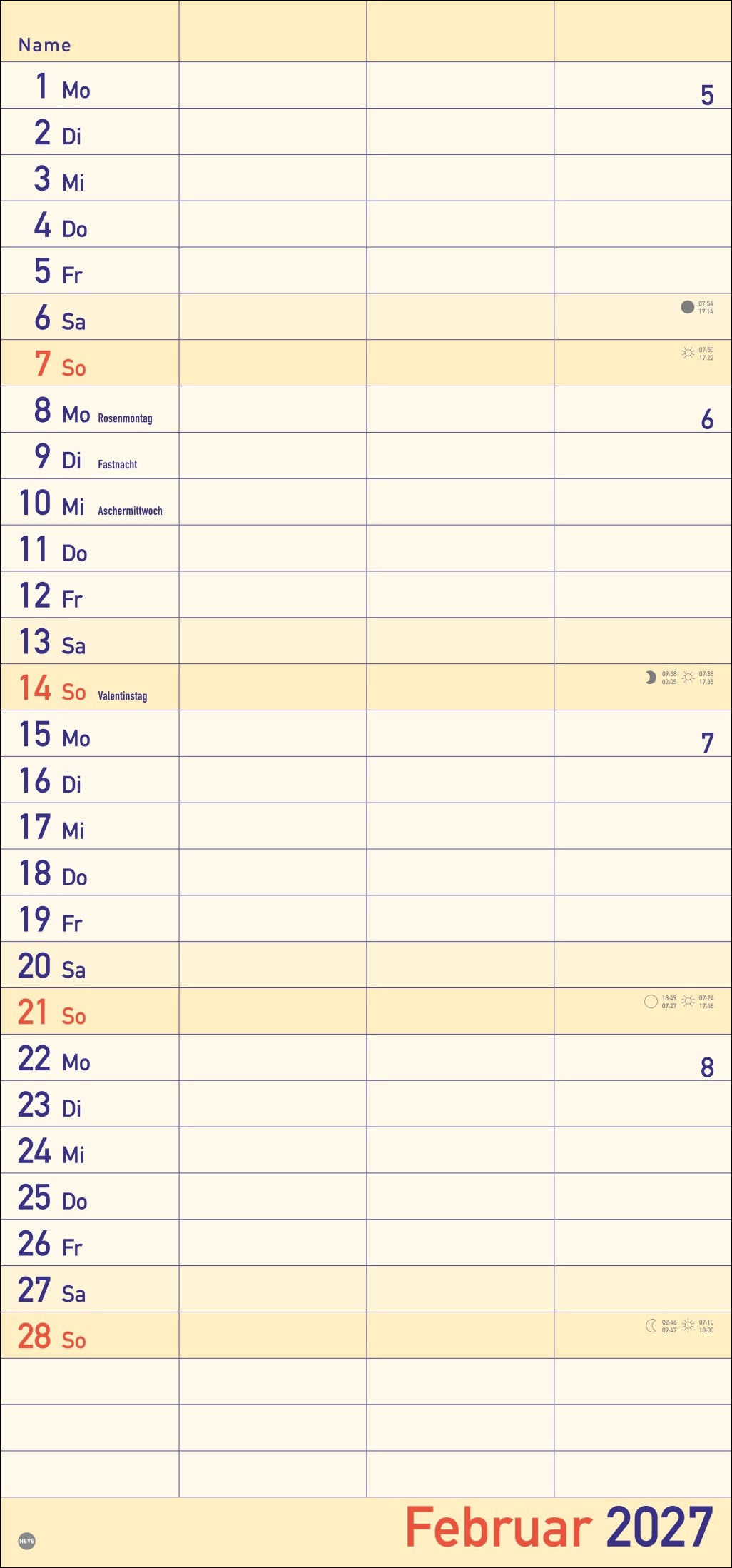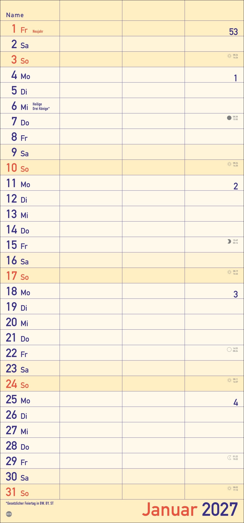 - Alle Termine im Blick: länglicher Monatskalender – groß gedruckt und mit breiten Spalten für eine gute Lesbarkeit