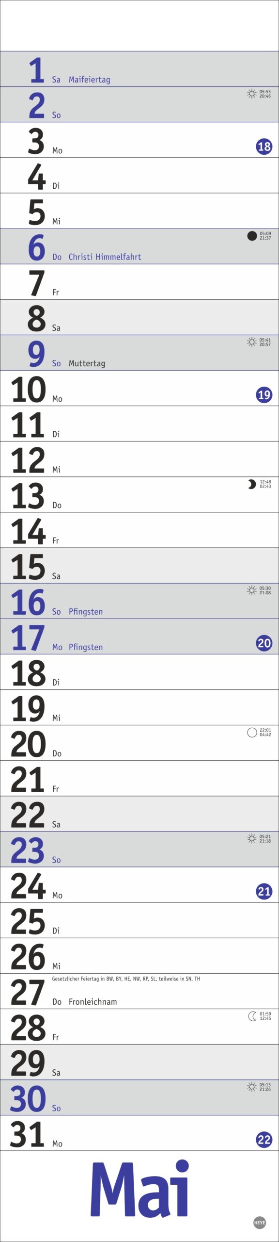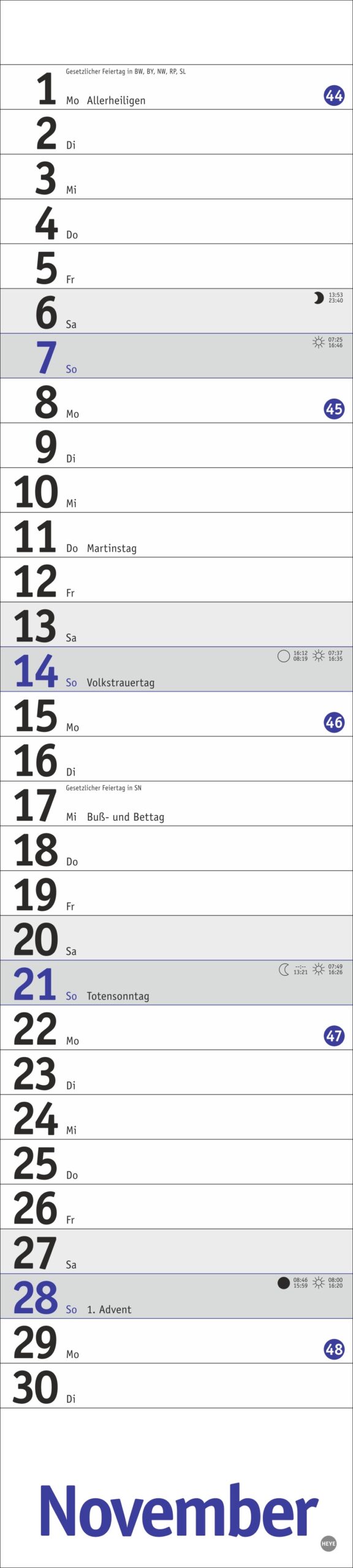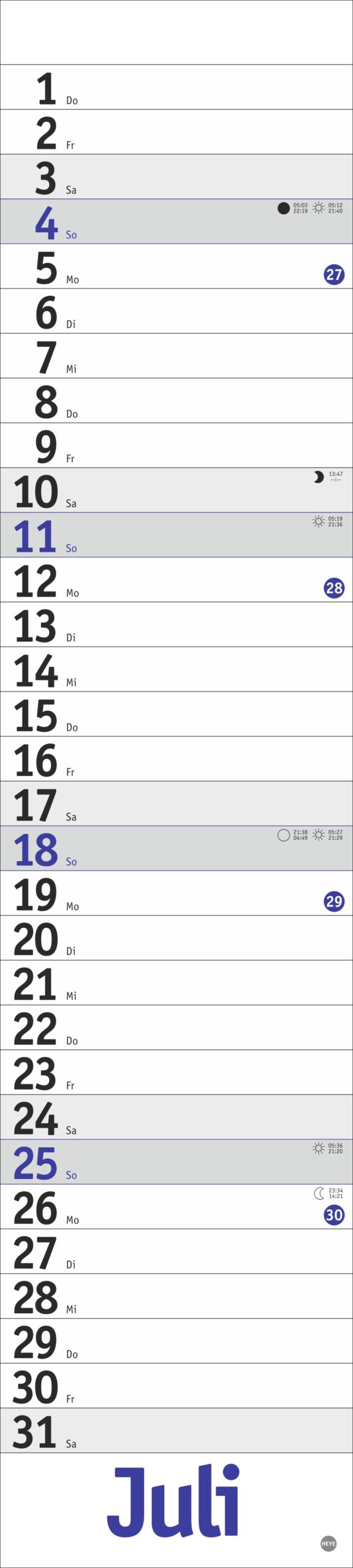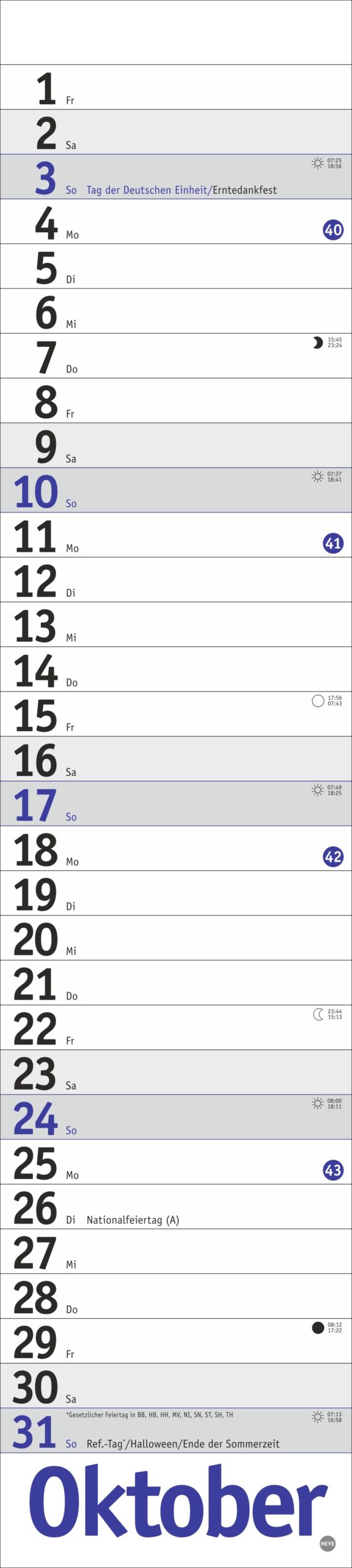- Streifenkalender mit Schulferien, Feiertagen und farblich abgesetzten Wochenenden: Das funktionale Design lenkt den Blick ganz auf Ihre Eintragungen
