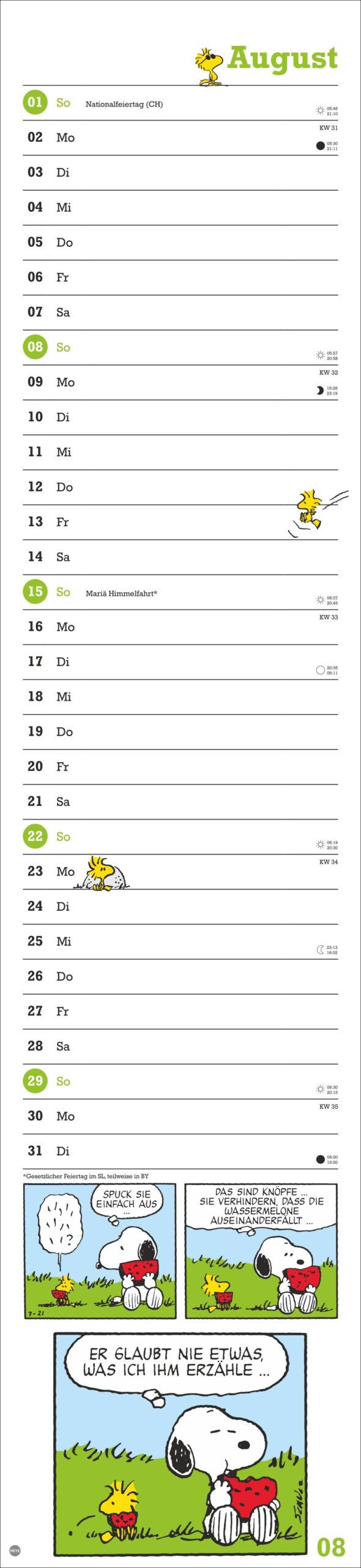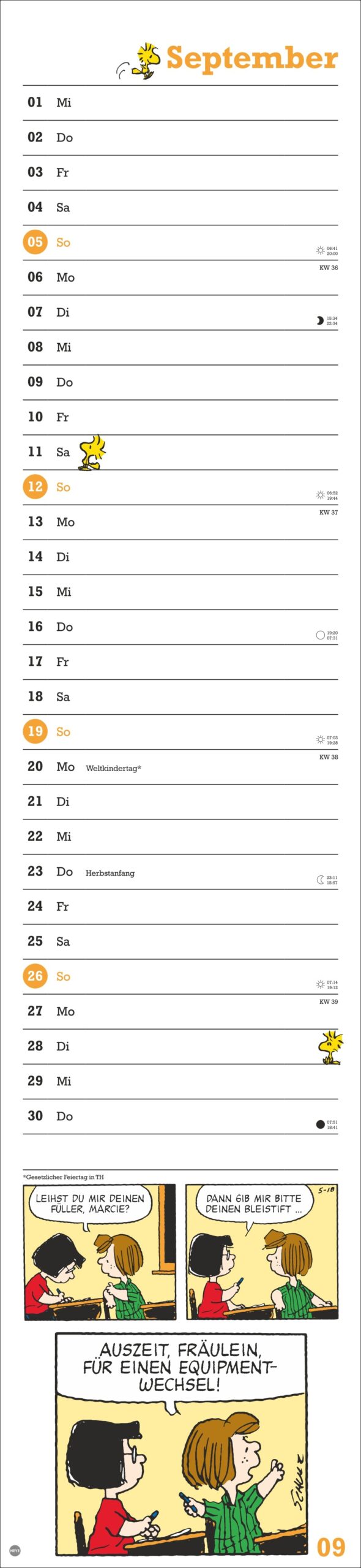 • Snoopy, Woodstock und Co. in einem länglichen Kalender für alle, die Terminübersicht und Cartoon-Liebe verbinden wollen