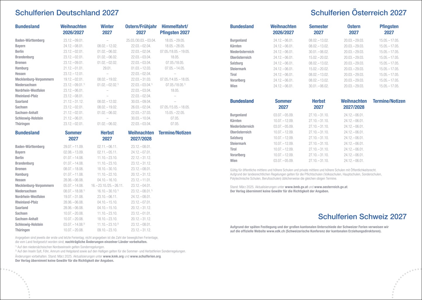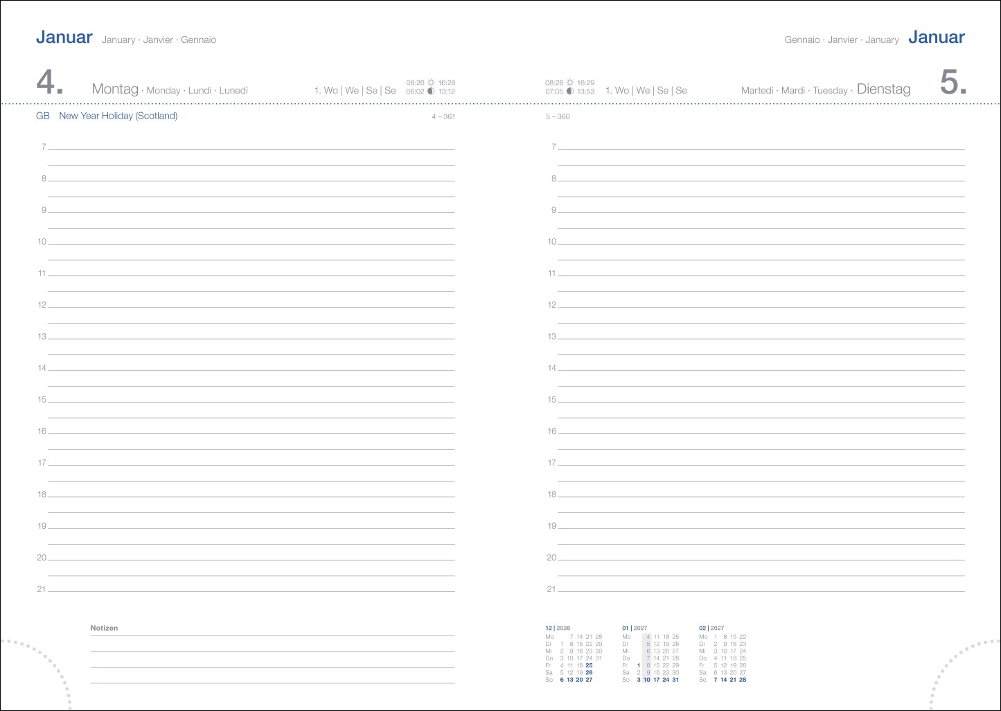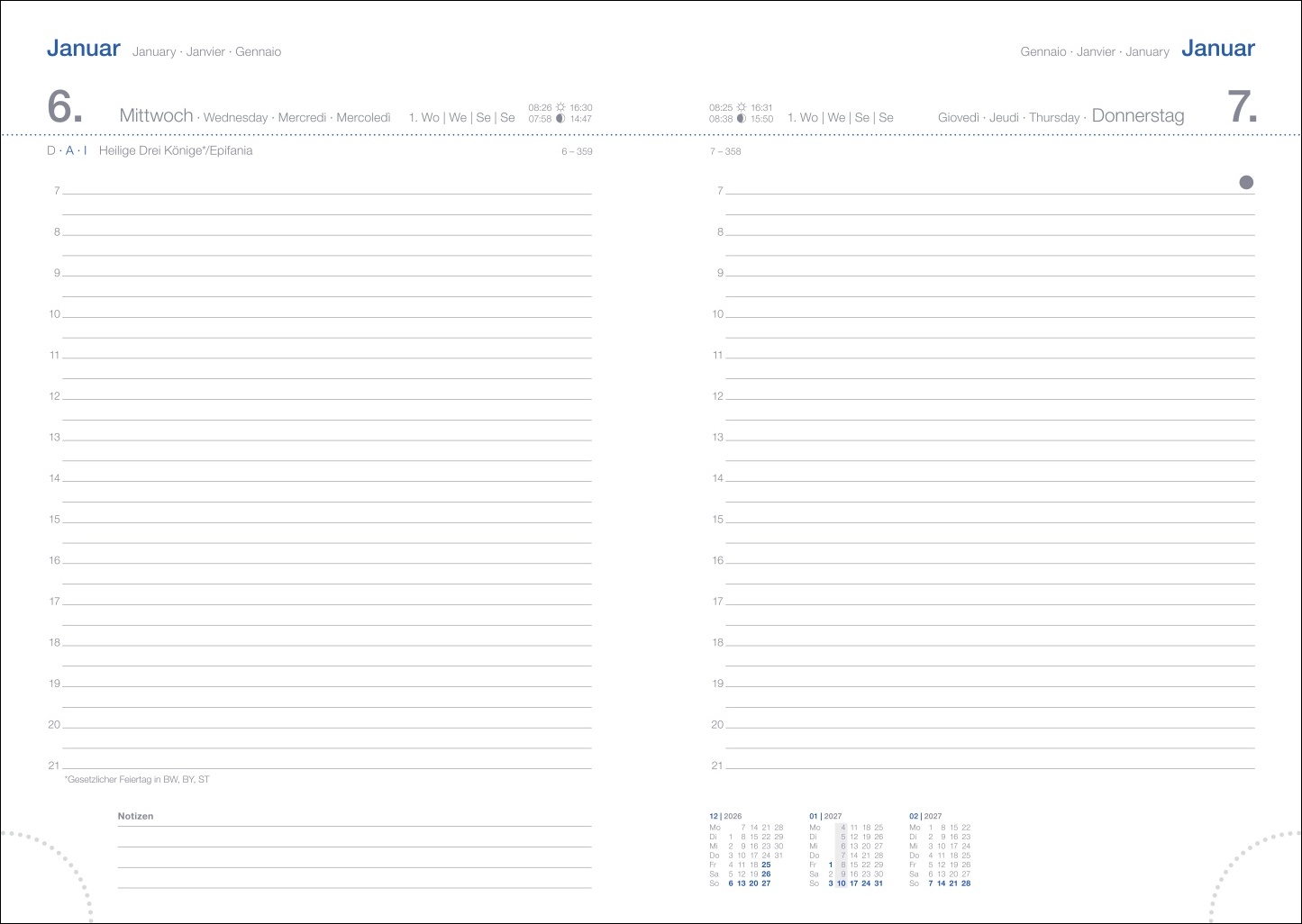 • Für alle, die gern Struktur in ihren Alltag bringen: Kalenderbuch im A5-Format mit einer Seite Platz pro Tag, extra Notizseiten, Schulferien und Jahresvorschau 2027