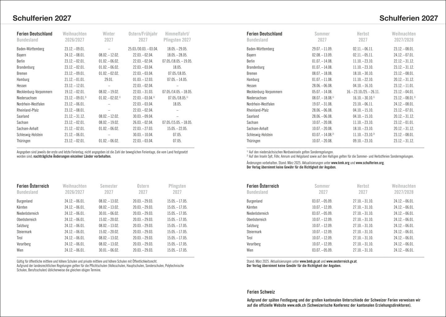 - Für alle, die viel vorhaben: Neutraler Kalender mit vertikalen Kalendarium, Jahresübersichten, Schulferien und Adressteil