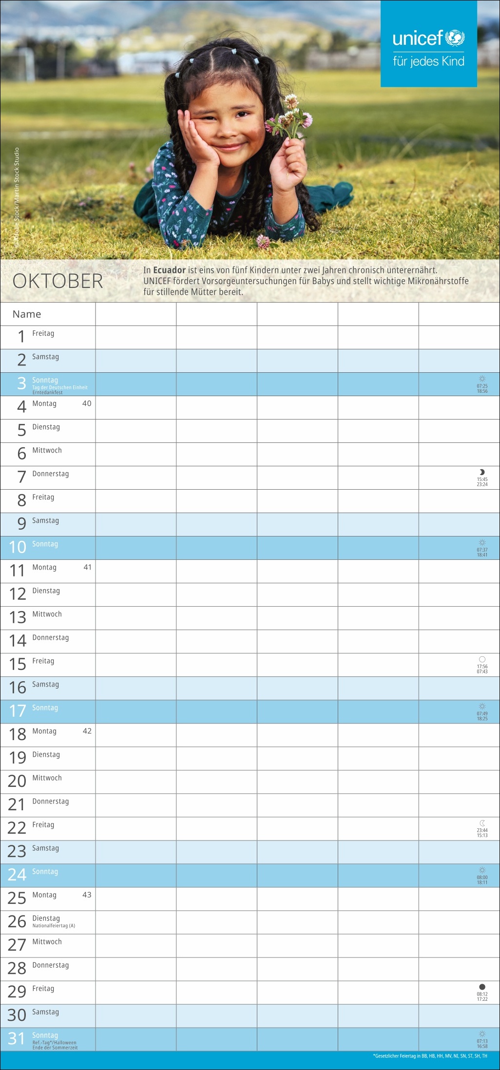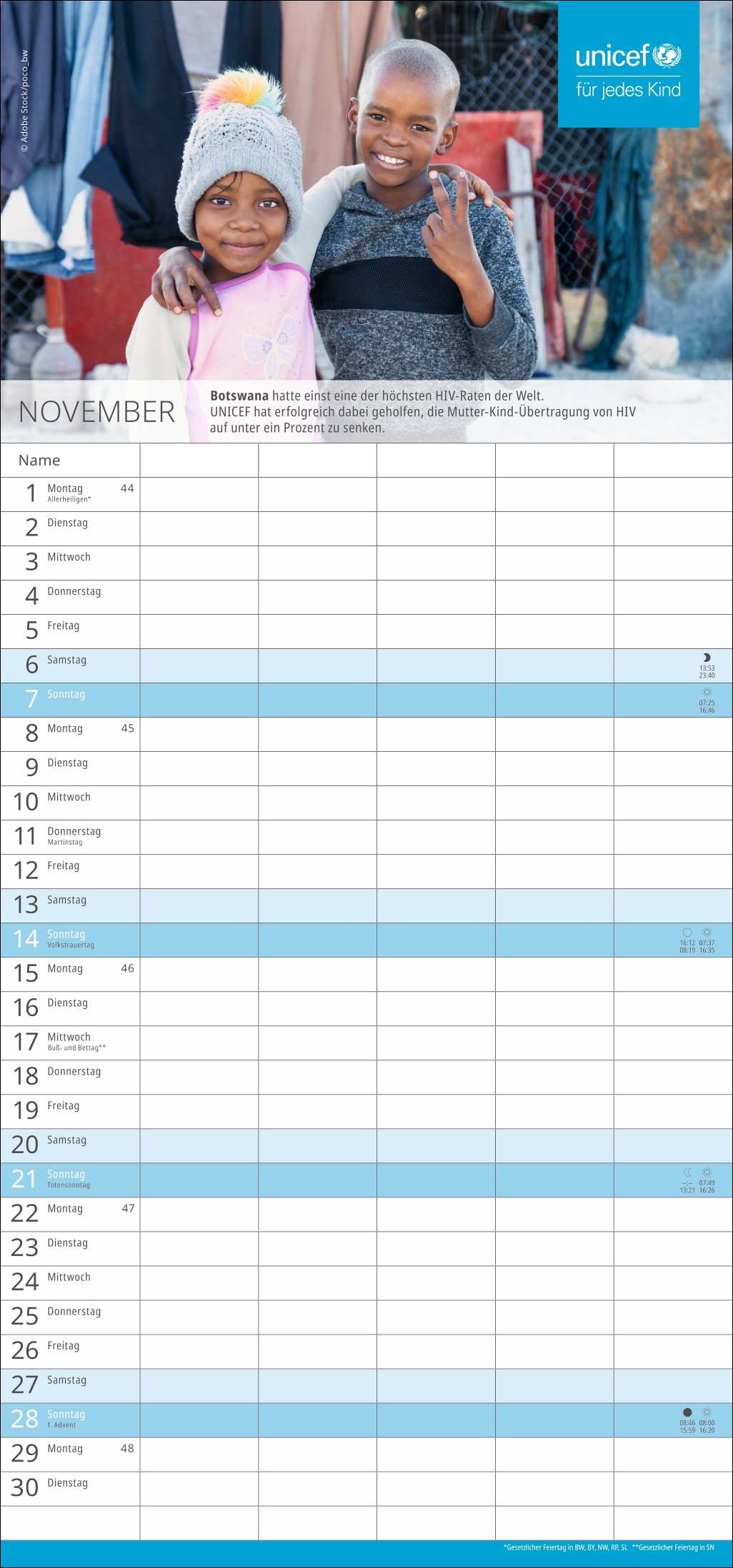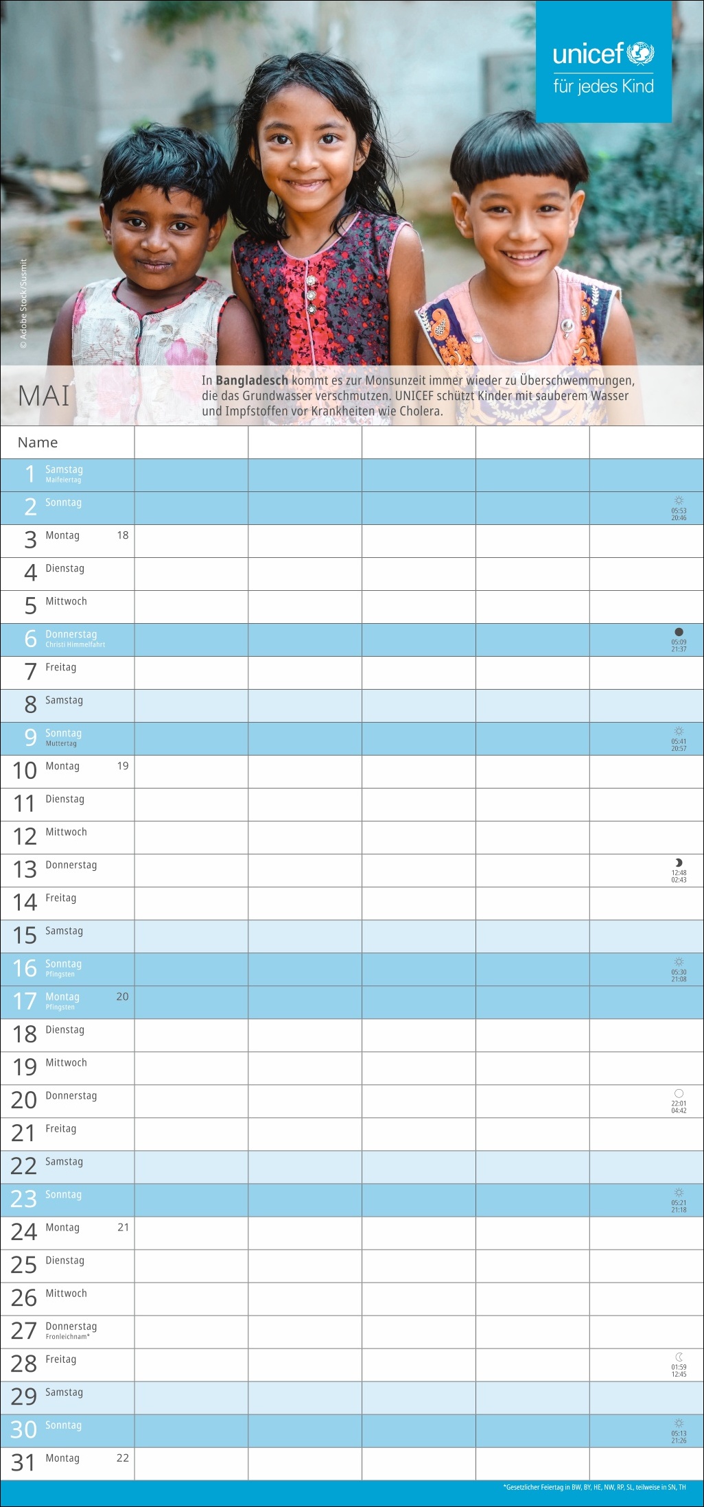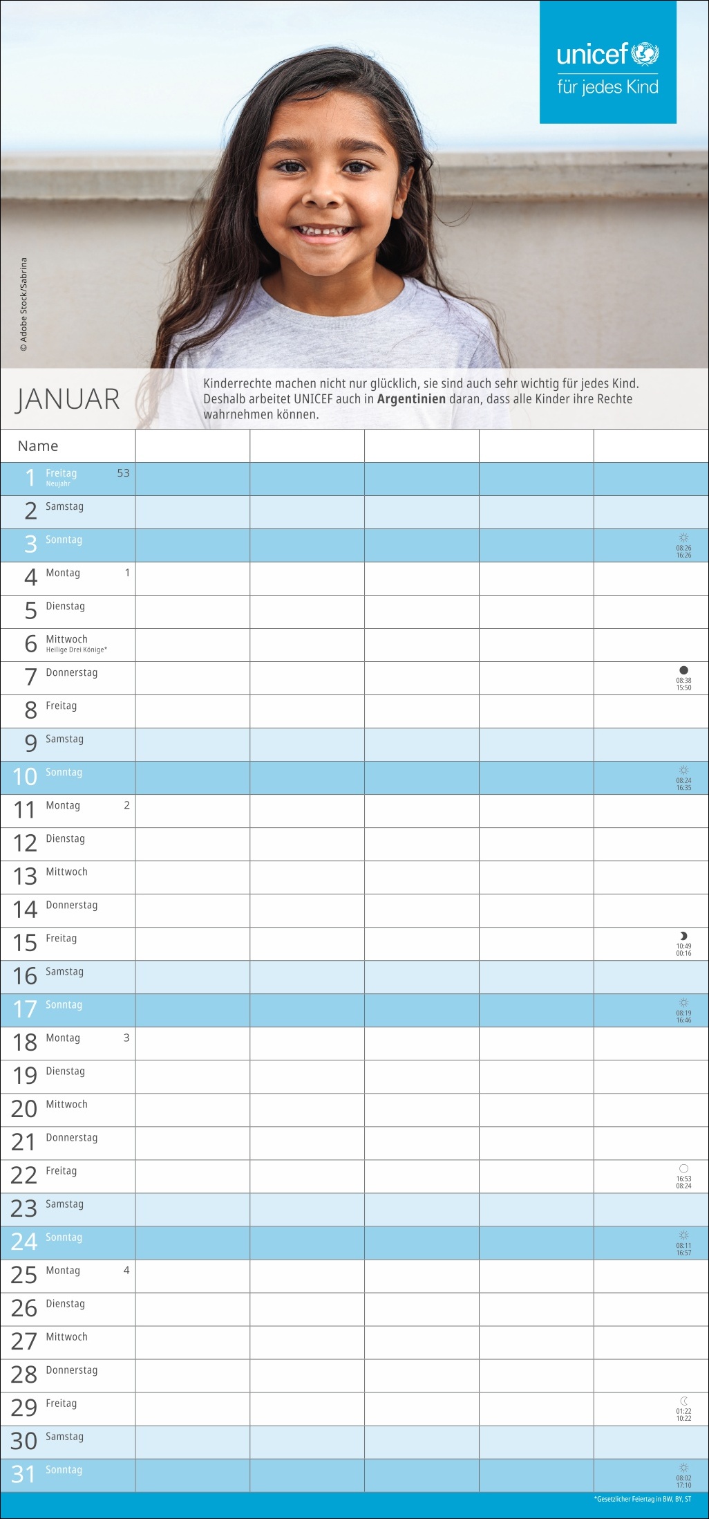 - Spenden Sie Hoffnung: Mit dem Kauf des Familien-Wandkalenders unterstützen Sie UNICEF und damit humanitäre Hilfe in über 190 Ländern