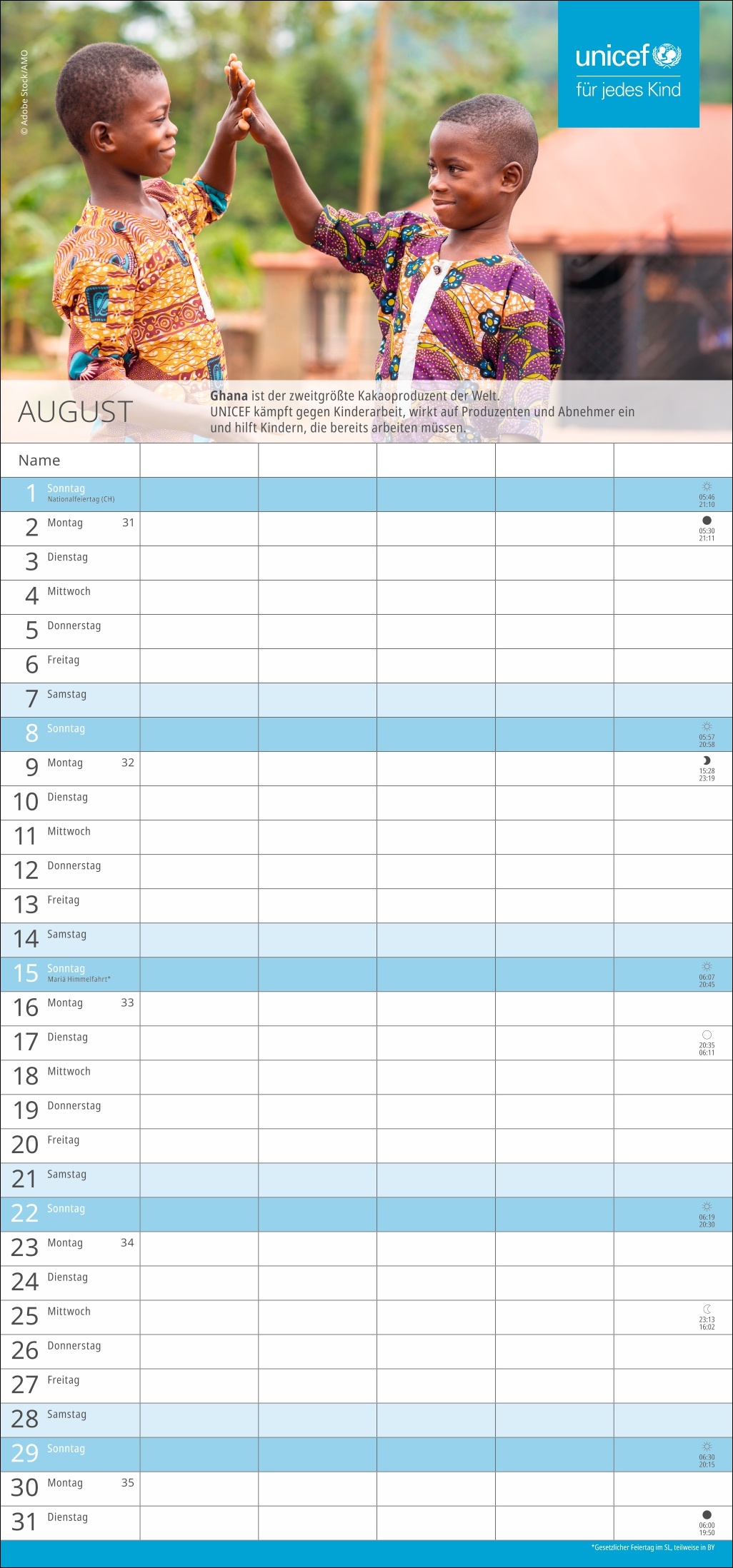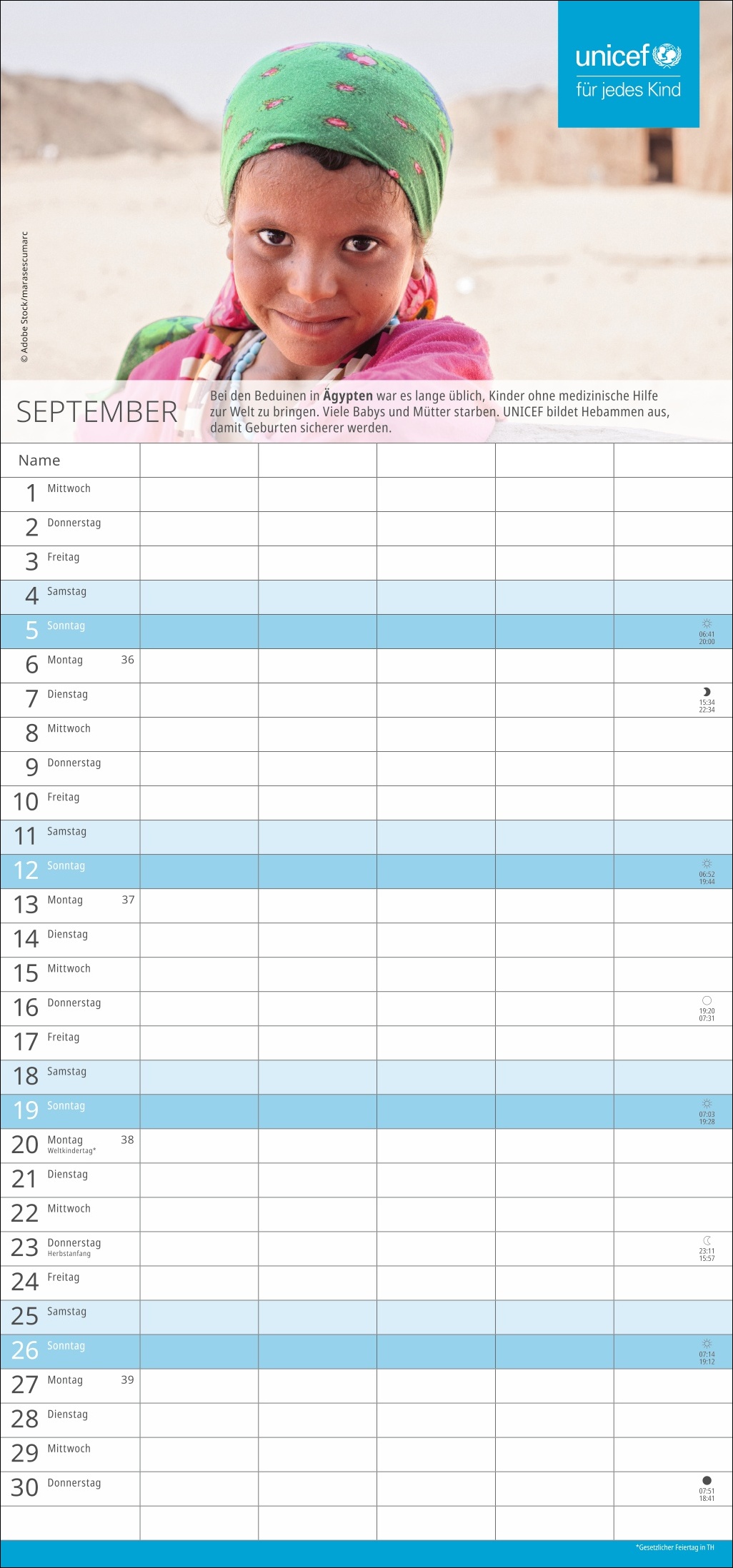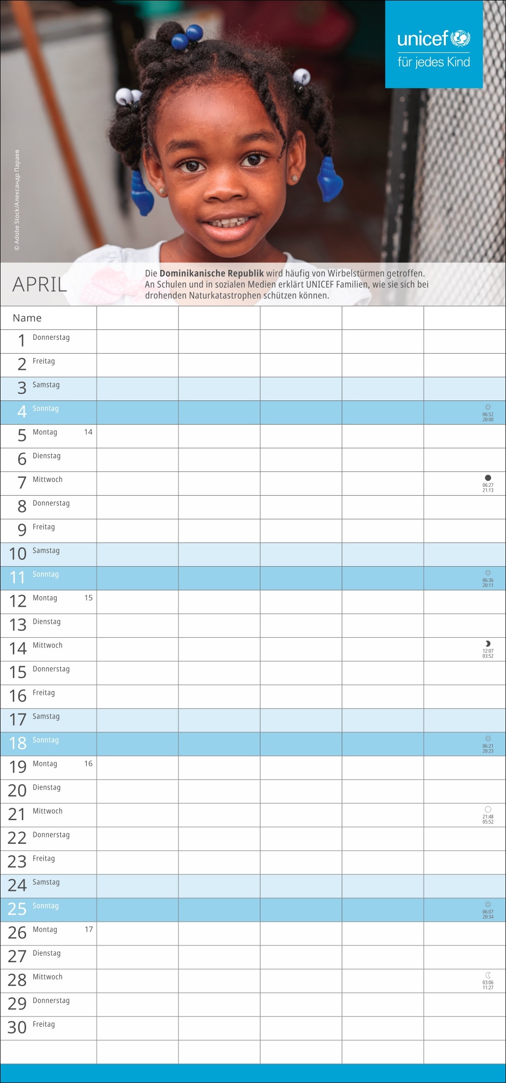 - Die nützliche Organisationshilfe, um Licht im Termin-Dschungel zu schaffen: Der fünfspaltige Familienkalender des Kinderhilfswerks der Vereinten Nationen
